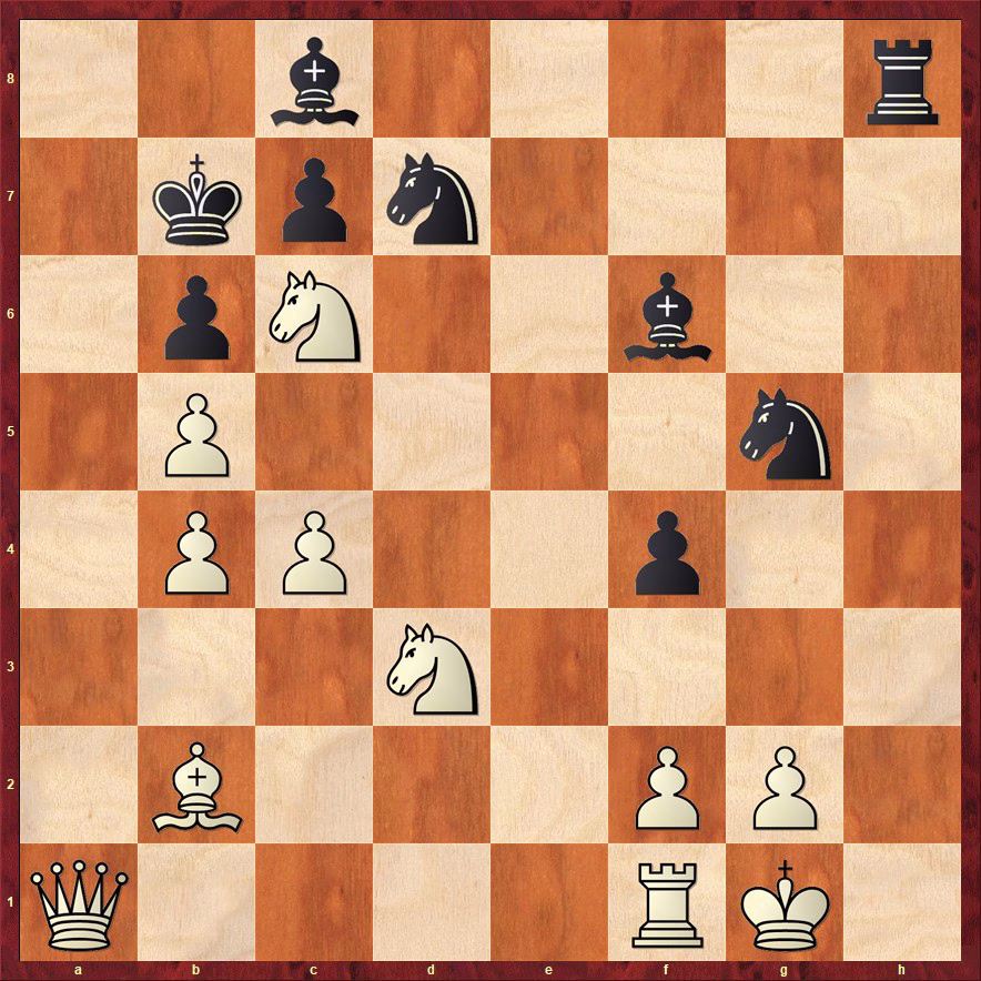 Het is denk ik 1. …Nf3+ 2. gxf3 (forced). Opent de g file zodat er eeuwig schaak gegeven kan worden met Rg8+, 3. Kh2 Rh8+ 4.Kg2 Rg8+ 5. Kh3! Hier moet met het paard en de witte loper wel een manier zijn om het voor elkaar te krijgen maar zo ver vooruit zie ik het niet meer zuiver.